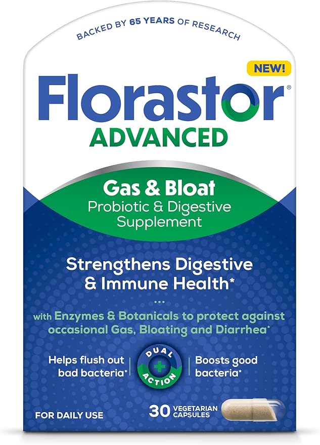 Florastor Advanced Gas and Bloat Probiotic, Digestive Enzymes and Botanicals, Plus Probiotics for Digestive Health, 30 Capsules