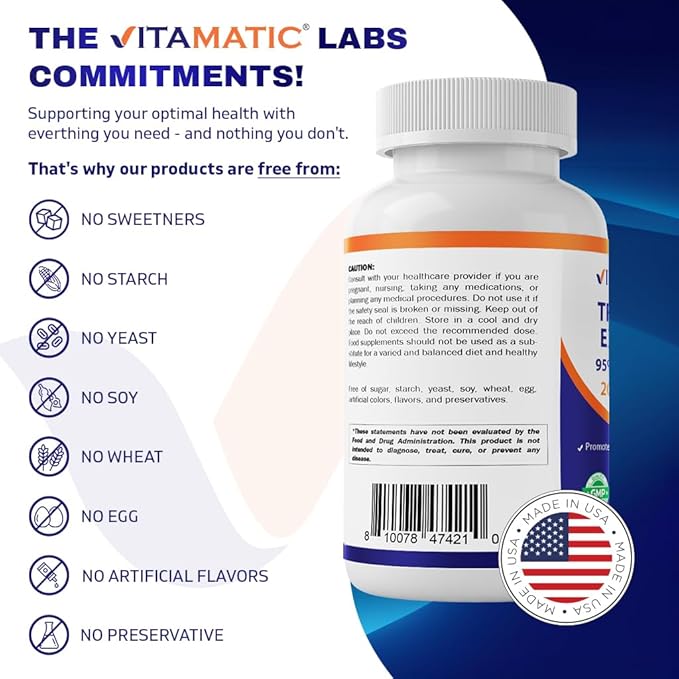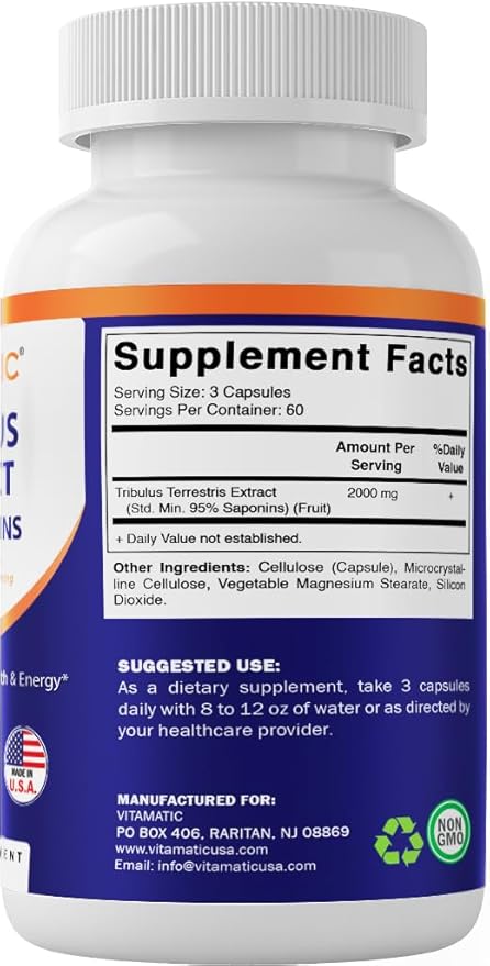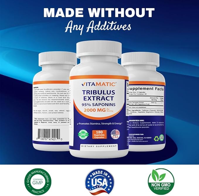 Vitamatic Tribulus Terrestris for Men - 2000 mg per Serving - 95% Saponins - 180 Vegetable Capsules - Made in The USA - Gluten Free & Non-GMO