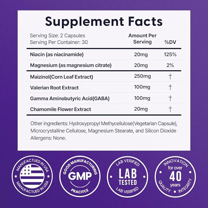 - NATURAL INGREDIENTS: Harnessing the power of nature, our formula features Maizinol, a patented natural ingredient, alongside traditional sleep aids for comprehensive support. - Maizinol 250mg, Valerian Root 100mg, GABA 100mg, Chamomile Flower Extract 20mg, Magnesium 10mg, Niacin 20mg.
