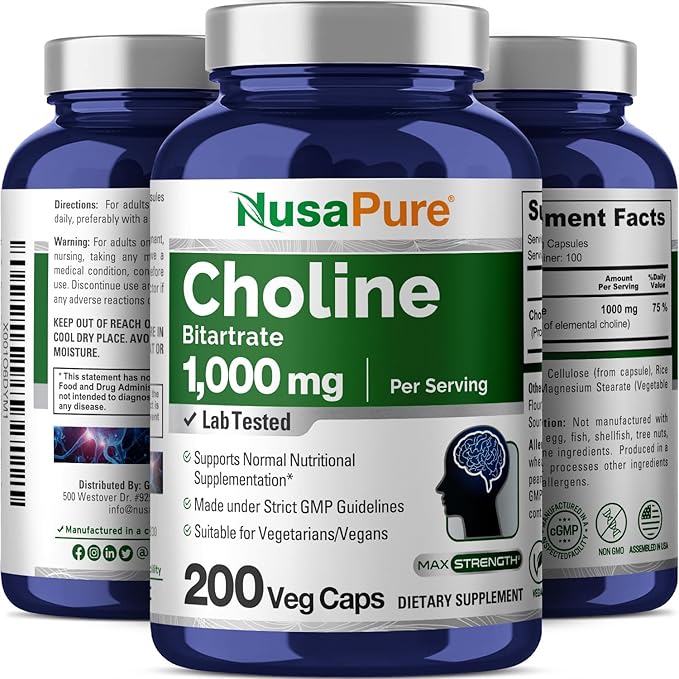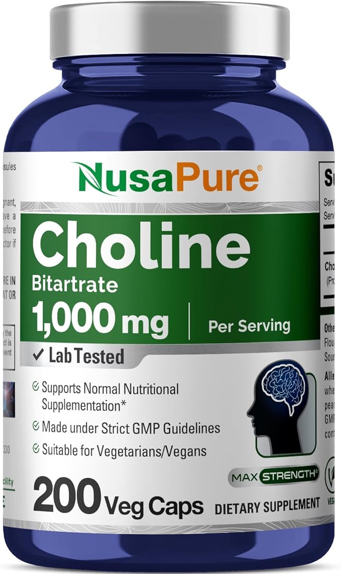 NusaPure Choline Bitartrate 1000 mg 200 Veggie Capsules (Vegan Vegetarian, Non-GMO)