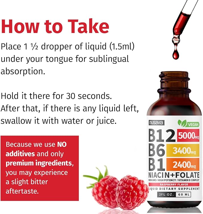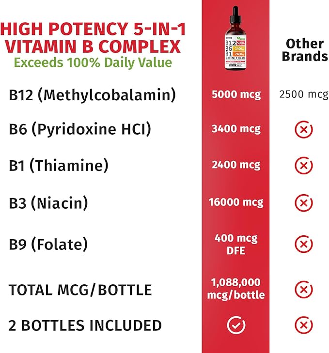 - B12 Drops Formulated for Maximum Potency - Our Liquid Vitamin B12 Drops contain Vit B12 5000mcg, B6, B1, Niacin, and Folic Acid, supporting overall body functions with 100% or more Daily Value.