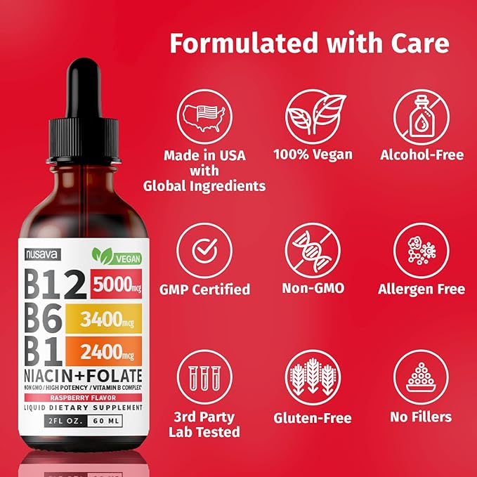 - Carefully Curated Organic Vitamin B12 Liquid - Our Vitamin B12 Methylcobalamin B6 B1 Drops contain No Fillers, are Vegan, Non-GMO, Gluten-Free, and proudly USA-made with Global Ingredients.