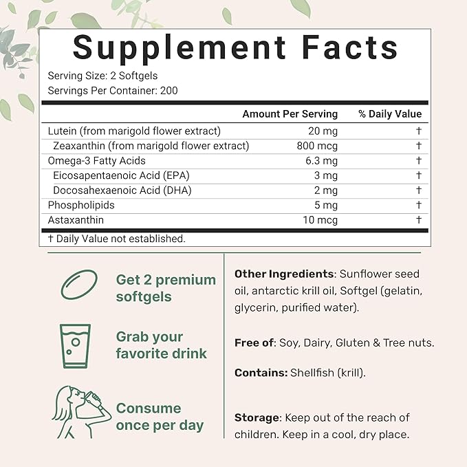 - 400 total softgels that provide easily absorbed ingredients with a virgin sunflower seed oil base. 2 softgel serving size that contains 20mg lutein, 800mcg zeaxanthin, 10mcg astaxanthin, 6.3mg omega-3 fatty acids, and 5mg phospholipids.
