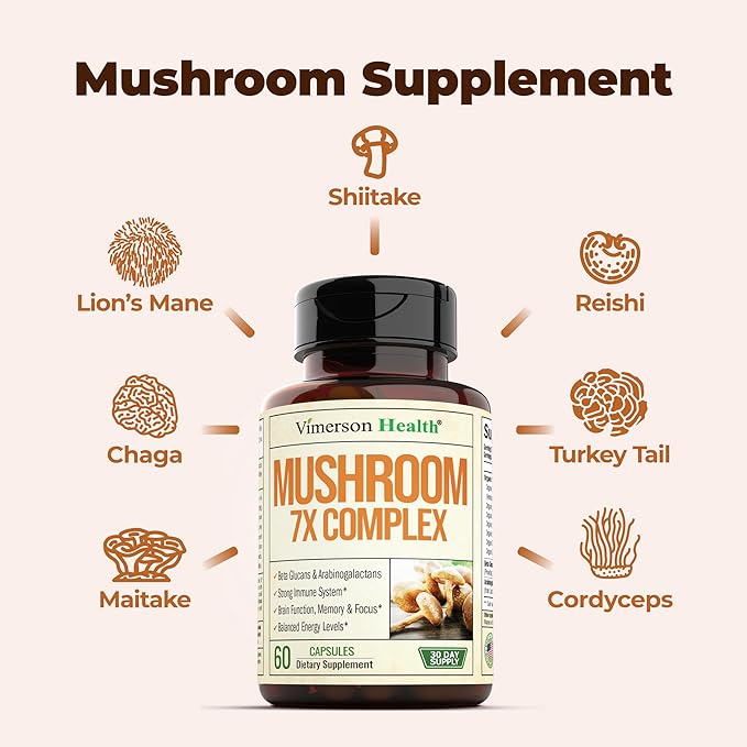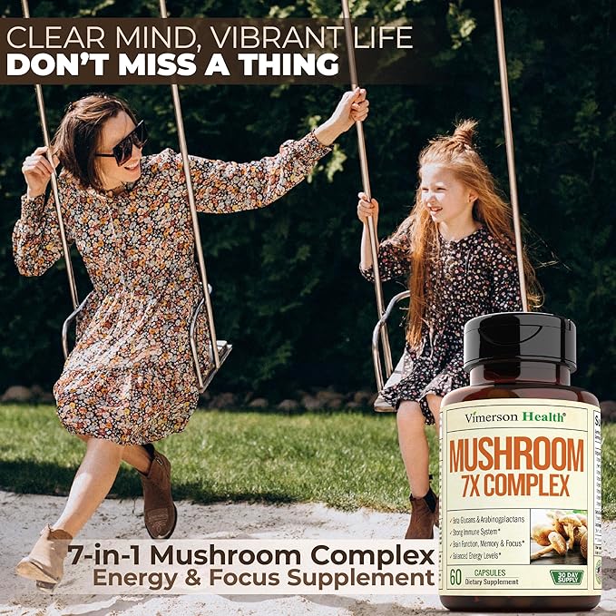 7-in-1 Mushroom Powder Supplement - Organic Lions Mane Powder, Reishi Mushroom, Cordyceps, Chaga. Mushroom Complex Capsules for Memory, Focus, Immune Support & Energy. 60 Turkey Tail Mushroom Capsules