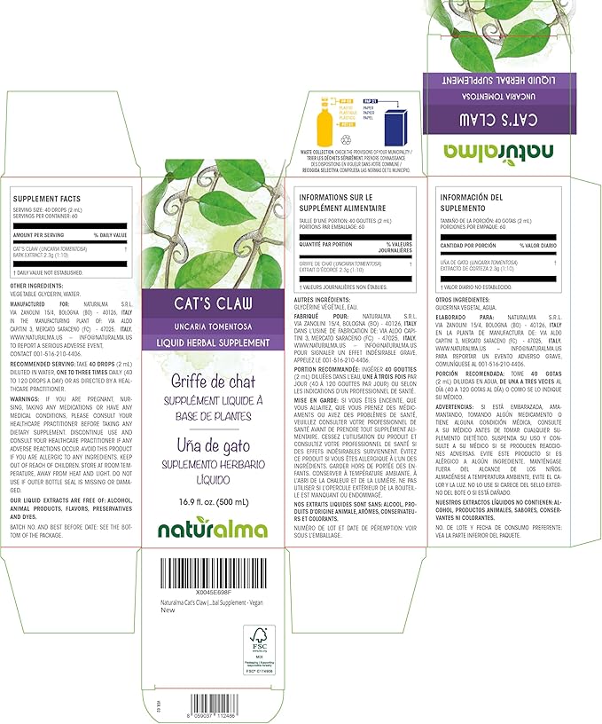 - Cat's Claw (Uncaria tomentosa) bark liquid extract or tincture concentrated 1:10. 100% natural, alcohol and sugar free. MADE IN ITALY. The dropper is NOT INCLUDED in the 500 ml format.