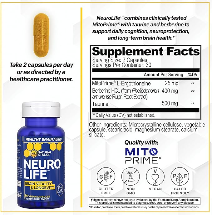 - 💊 Berberine Supplement with MitoPrime L-ergothioneine & Taurine 🧪 As you get older, your brain cells need a bit of help. Luckily, NeuroLife may support healthy cellular aging in the brain based on preclinical studies.*+ It's smart to take berberine, l-ergothioneine, and a taurine supplement with each passing year. Why? Because tiny molecules in the body called free radicals create something known as oxidative stress. By safeguarding cells from oxidative stress, you’ll promote a healthier brain.