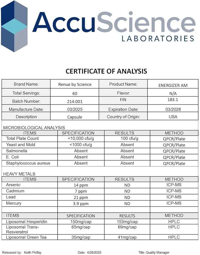 - QUALITY AND SAFETY ASSURED - Energizer AM is manufactured in a GMP compliant, FDA registered facility, and undergoes rigorous third-party testing to ensure the highest quality standards for your well-being.