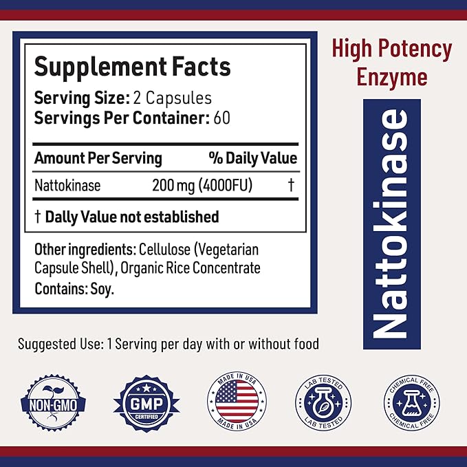 Nattokinase Supplement 4000 FU 200mg - Enzyme - Cardiovascular Support 120 Capsules -Derived from Japanese Natto - Made in The USA Without Magnesium Stearate.