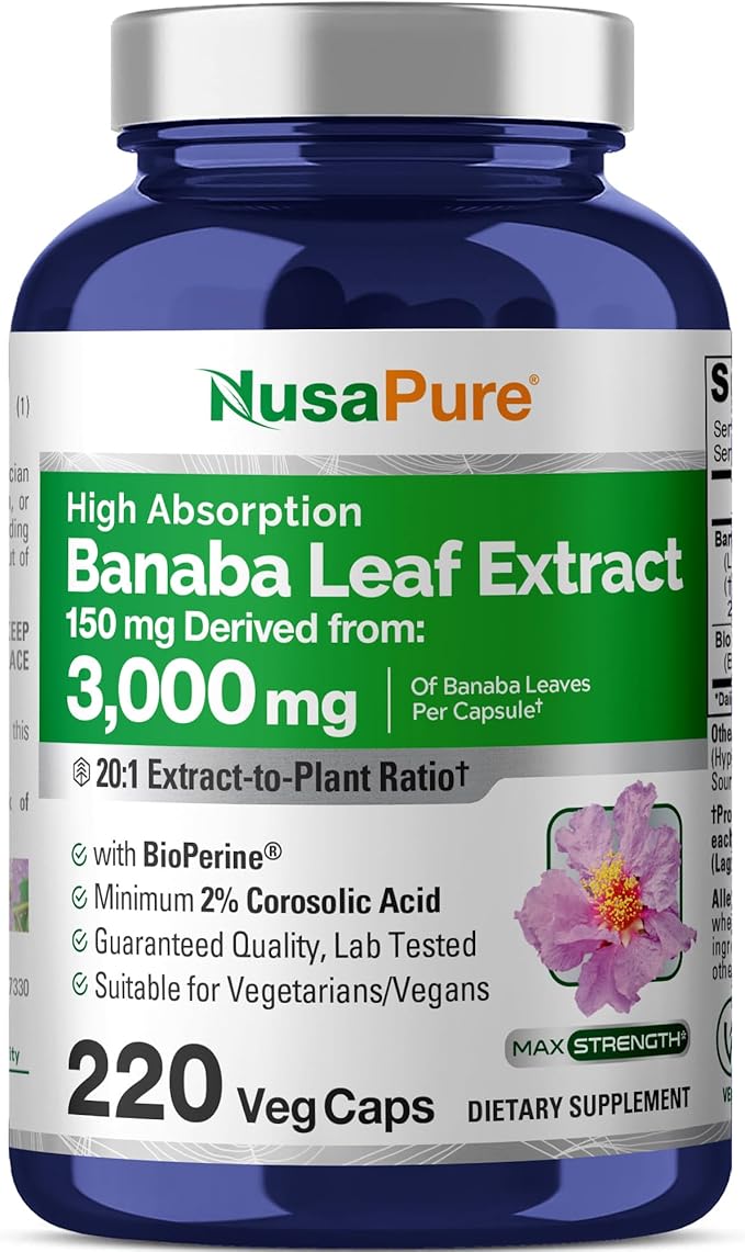 - High Absorption Banaba Leaf Extract equivalent to 3,000mg per capsule 220 Veggie Caps for a 220-Day Supply