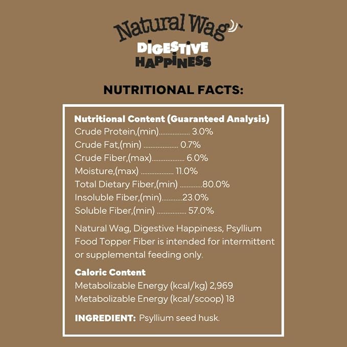 - No Artificial Ingredients: Natural Wag Digestive Happiness is free from artificial ingredients. We use only 100% natural psyllium husk fiber, providing a wholesome and clean solution for your dog's digestive needs.