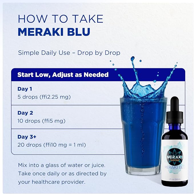 - Mood and Focus Support: The Meraki methylene blue drops may support a positive mindset and maintaining emotional balance through potential support of neurotransmitter function