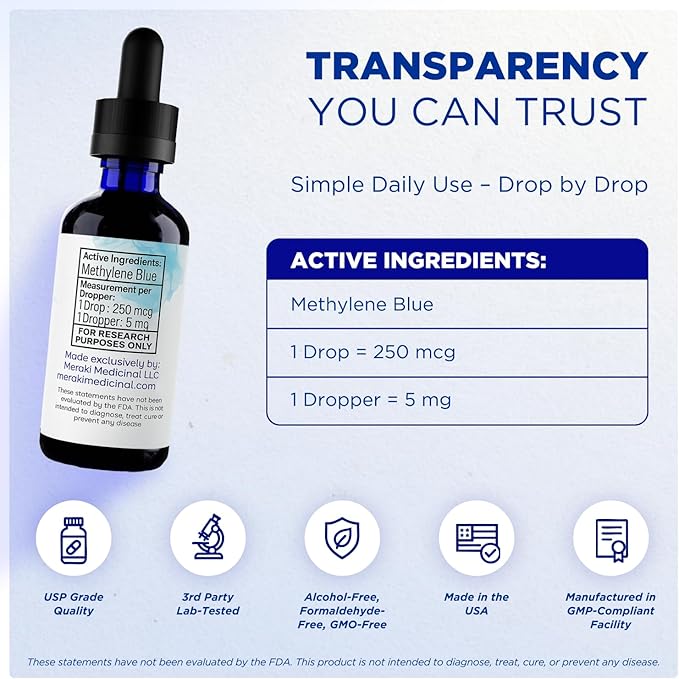 - Purity and Potency in Every Drop: Made in a GMP-compliant facility, our methylene blue drops undergo third-party lab testing to help ensure purity from heavy metals and unwanted compounds