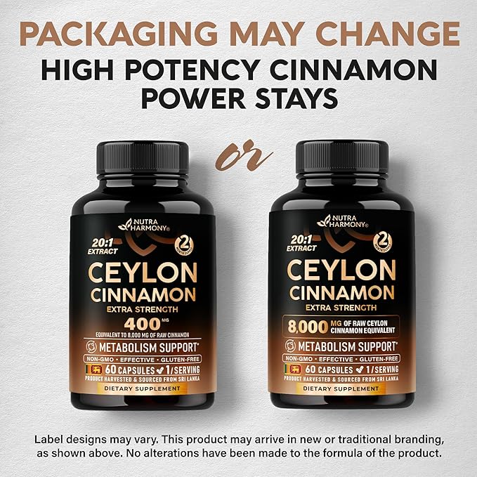 - Ceylon Cinnamon — Unlock the power of Ceylon Cinnamon and experience it’s potency with NUTRAHARMONY. Embrace the concentrated power and elevate your wellness journey. Packaging may vary. No changes have been made to the product’s formula or ingredients.