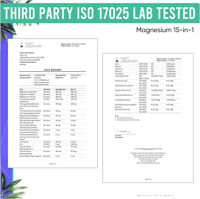 - GMP and ISO 17025: Adndale Magnesium Glycinate Plus+ gummies undergo production in a GMP certified facility and are third-party tested by an ISO 17025 certified lab. Lab testing of each batch ensures reliability and effectiveness as a resting support solution, with the test certificate included in the product listing.