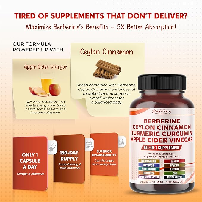 - Unique Combination: PeakPury Berberine offers a potent mix of 14 ingredients per serving, including Berberine, Cinnamon, Apple Cider Vinegar, Turmeric, Proprietary Blend, Zinc, and Black Pepper.