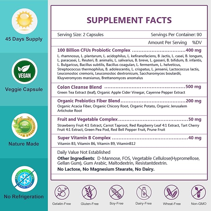 - 5 in 1 Probiotics for Overall Health: Our probiotics for women-men contain 100 billion CFUs, PROPRIETARY COLON CLEANSE COMPLEX, PREBIOTICS FIBER, FRUIT & VEGETABLE COMPLEX, and VITAMIN B to support your body healthy. Probiotics broad spectrum contains 30 strains to support intestinal strain diversity, suitable for people over 10 years old, probiotics are enteric coated, have no refrigeration, and can resist stomach acid and bile, increasing the absorption rate of probiotics by 10X.