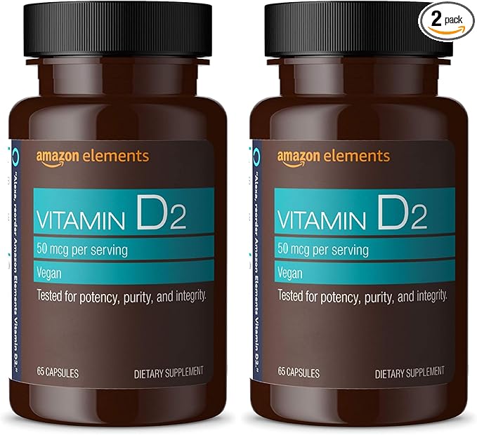 Amazon Elements Vitamin D2 2000 IU, Vegan, 65 Capsules, Supports Strong Bones and Immune Health, 2 Month Supply (Packaging May Vary) (Pack of 2)