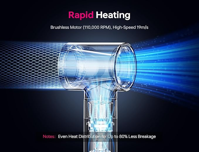 - ๐๐๐๐ข๐๐ข๐๐ง๐ญ ๐๐๐,๐๐๐ ๐๐๐ ๐๐ซ๐ฎ๐ฌ๐ก๐ฅ๐๐ฌ๐ฌ ๐๐จ๐ญ๐จ๐ซ: Featuring a high-performance 110,000 RPM brushless motor and a robust airflow, this tool can rapidly dry wet hair, cutting down styling time and conserving your time and energy.