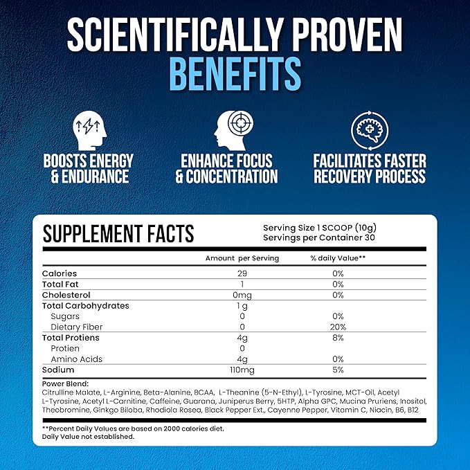 - Premium Ingredient Blend: Our pre workout powder for women and men is crafted with a potent blend of ingredients such as Beta-Alanine, Citrulline Malate, L-Theanine, L-Tyrosine, Alpha-GPC, MCT-Oil, 5HTP, Ginkgo Biloba and amino acid powder