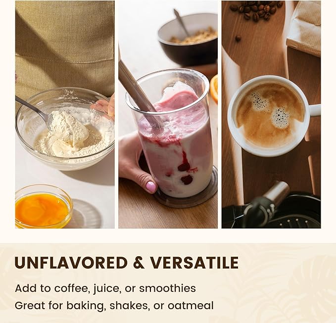 - Versatile Unflavored Powder for Easy Mixing: Scoop, swirl, and sip—this unflavored powder blends smoothly into coffee, tea, smoothies, or shakes without altering the taste. For the best texture, we recommend dissolving it in a small amount of warm liquid first, then adding it to your favorite hot or cold drink