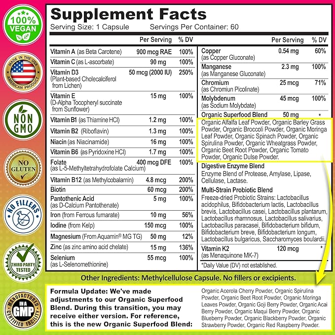 - Vegan Multivitamin Enriched with Organic Superfoods: This dynamic formula blends essential vitamins and minerals with powerful superfoods like organic Alfalfa Leaf, Moringa Leaf, Spirulina, Dulse, and more. Packed with nutrients and antioxidants, it provides an added boost often missing from the average diet.