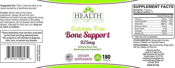 Health As It Ought To Be Calcium Free Bone Support Supplement | Ultimate Bone and Cardiovascular Protection | 180 Capsules