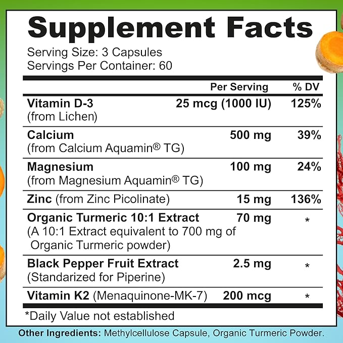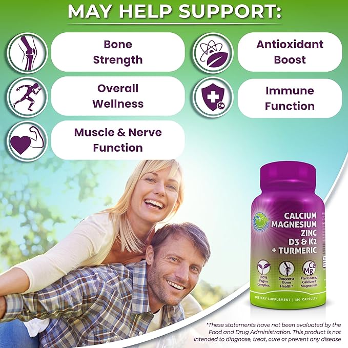 - 7-in-1 Bone Health Complex: Magnesium and vitamin D3 are essential for calcium bioavailability. Zinc enhances magnesium absorption, while vitamin K2 directs calcium to the bones. Turmeric supports active lifestyle and overall wellness, and black pepper improves nutrient bioavailability.