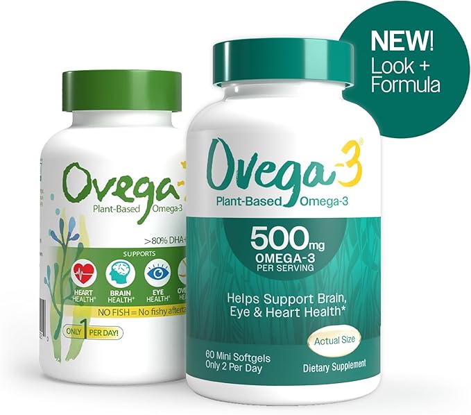 OVEGA-3 Plant-Based Omega-3 from Algal Oil Daily Supplement, 500mg, Supports Brain, Eye & Heart Health, Two mini softgels per Day, 60 Count