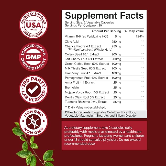 - PREMIUM HERBAL BLEND FOR MAXIMUM EFFECTIVENESS – Featuring Turmeric, Tart Cherry, Green Coffee Extract, Celery Seed, Chanca Piedra, Quercetin, Bromelain, Vitamin B6 & Citric Acid, these potent ingredients work together to support immune balance, healthy circulation, and kidney detox & health.