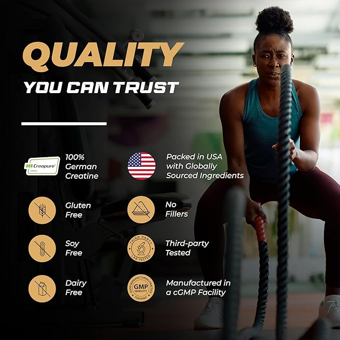 - PURITY & QUALITY: Our German Creatine Supplement is packed, tested, & distributed in the USA according to strict cGMP norms. This creatine supplement is free from gluten, soy & dairy. One bottle offers 60 servings. It is ๐ง๐ต๐ถ๐ฟ๐ฑ-๐ฝ๐ฎ๐ฟ๐๐ ๐๐ฒ๐๐๐ฒ๐ฑ for purity and potency & made in an ๐ก๐ฆ๐-๐ฐ๐ฒ๐ฟ๐๐ถ๐ณ๐ถ๐ฒ๐ฑ ๐ณ๐ฎ๐ฐ๐ถ๐น๐ถ๐๐.