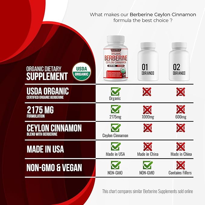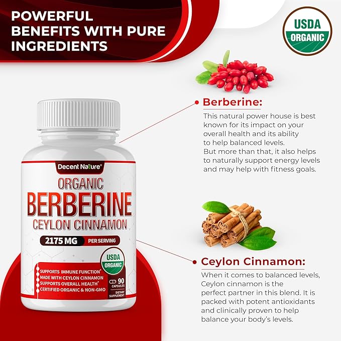 - Nature’s Superior Formula - Each serving of our Organic Berberine brings you the very best that nature has to offer for your health. We combine Organic Berberine with Ceylon Cinnamon to help you feel balanced and energetic all day long. With 2175 mg packed in every serving and 90 capsules per bottle, our non-GMO Organic formula will support you everyday throughout the month. Get ready for a more vibrant and health-focused life.