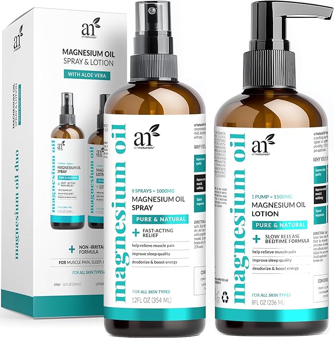ArtNaturals Magnesium Oil Spray 12 oz + Body Massage Lotion Set 8oz for Feet & Sleep - Extra Strength Cream Ultra-Pure, Relief & Relaxation, Muscle Health Leg & Joint Care Topical Non Itch