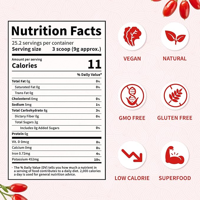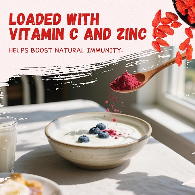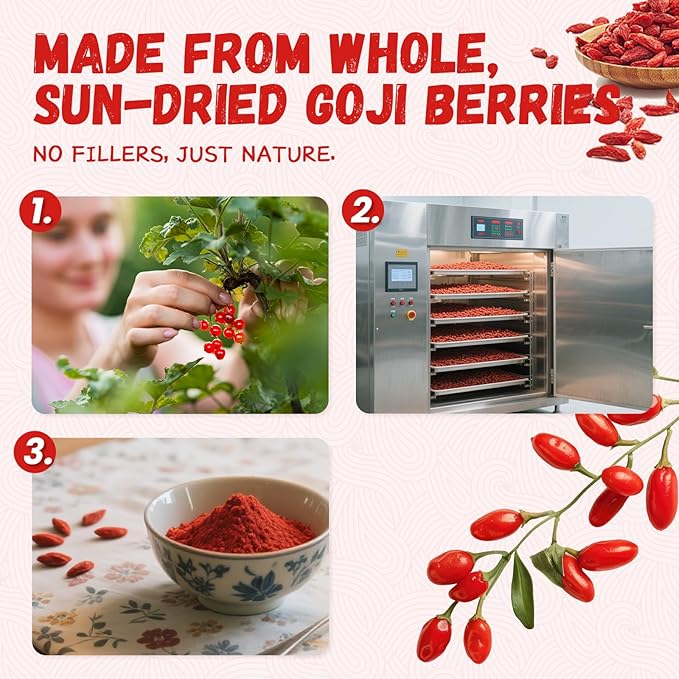 - 100% Natural Goji Berries: Made from carefully dried and finely ground whole goji berries, with no additives, fillers, or preservatives—just pure, nutrient-rich fruit.
