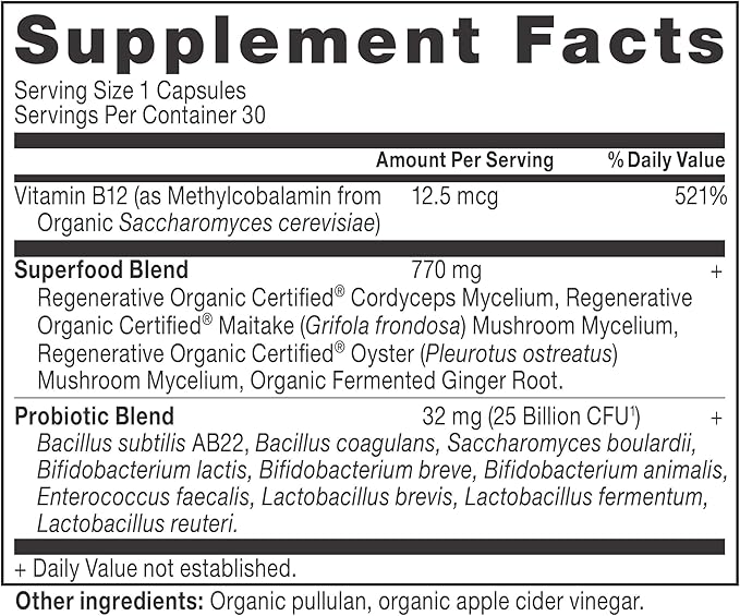 - This first-ever Regenerative Organic Certified Daily Probiotics formula packs 25 billion CFUs1 with gut-friendly superfoods: cordyceps mycelium, maitake mycelium and fermented ginger root, all grown in nutrient-dense soil.