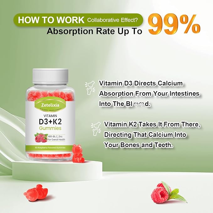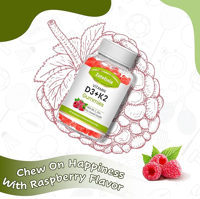 - Juicy Raspberry Goodness in Every Bite: Each bottle contains 120 Vitamin D3 K2 gummies, providing a 60-day supply. Zetelixia's raspberry flavor offers a delightful blend of sweet and sour, making these gummies a refreshing and essential part of your daily routine, whether enjoyed solo or with friends