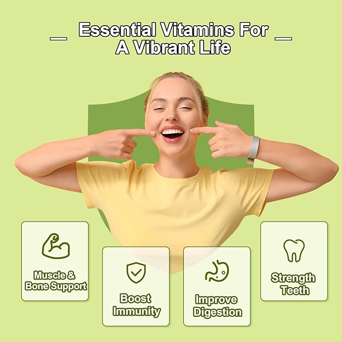 - Boosts Immune System, Strengthens Muscles & Bones: Vitamin D3 and K2 work together to balance calcium and phosphorus, enhancing absorption and supporting bone health. Vitamin B6 and zinc are essential for enzymatic reactions, protein metabolism, and immune function. Vitamin C boosts iron absorption, aids collagen synthesis, and supports skin, cartilage, teeth, and muscle health