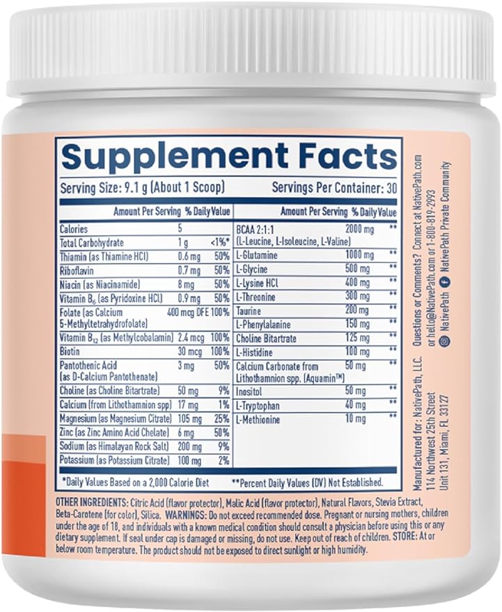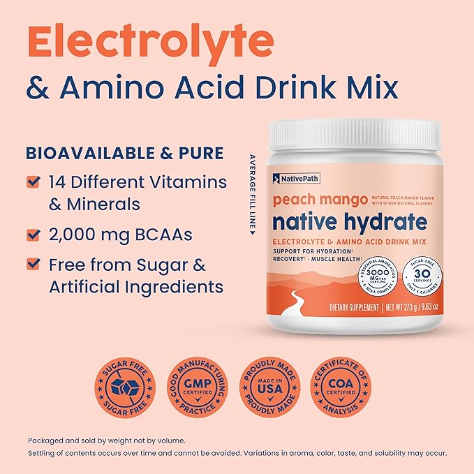 NativePath Native Hydrate, Zero Sugar, Electrolytes Powder with BCAAs, Peach Mango Hydration, Keto & Paleo Friendly, 30 Servings
