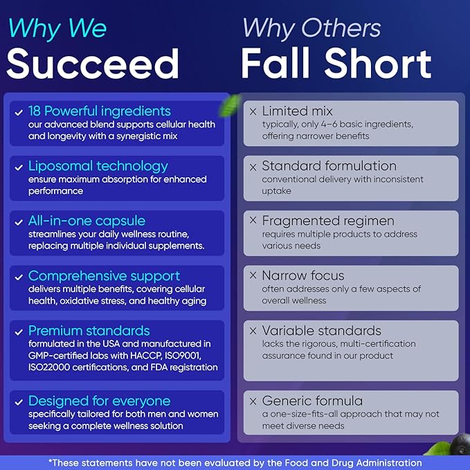 - Superior value & no supplement clutter: Enjoy superior value with 90 capsules per bottle, providing a generous 45-day supply. Bid farewell to the clutter of multiple supplements, as this 18-in-1 nad supplement pure organic resveratrol berberine Fusion simplifies your wellness routine, offering a dynamic blend in a single capsule