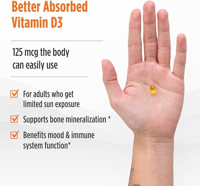 - BETTER ABSORPTION - Each easy-to-swallow, mini Vitamin D3 soft gel provides 5000 IU (125 mcg) of cholecalciferol, the natural, most easily absorbed and utilized form of vitamin D. Vitamin D3 5000 has a great orange flavor.