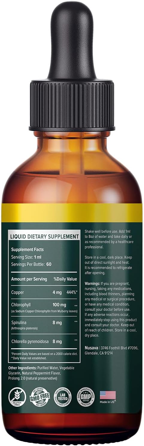 - Chlorophyll Liquid Drops Formulated for Maximum Potency: Each dose of Nusava's Liquid Chlorophyll Drops contains 100 mg of Chlorophyll (as Sodium Copper Chlorophyllin), 8.34 mg of Spirulina, 8.34 mg of Chlorella, and 4 mg of copper.