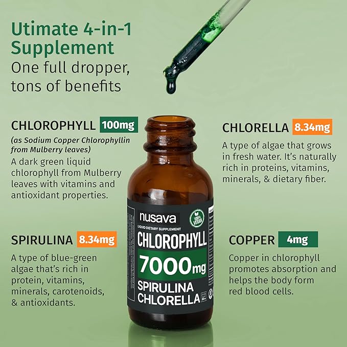 - All-in-One Superfood: Nusava’s liquid chlorophyll supplement is packed with maximum nutritional benefits. Each serving of our liquid chlorophyll supplements provides you with the equivalent daily veggies you need. Should you be unhappy with your purchase, just reach out to us.