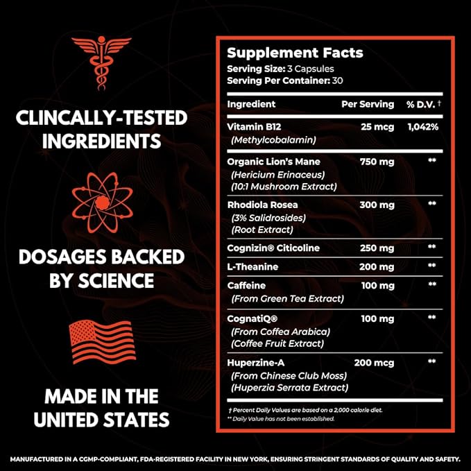 - š§ šš”ššš”ššš šš¢šš”šš§šš©š ššØš”šš§šš¢š”: Our all-natural nootropic capsules are formulated with organic Lion's Mane Mushrooms, Rhodiola Rosea, Cognizin Citicoline, CognatiQ, Green Tea Caffeine, L-Theanine, Huperzine-A, & Vitamin B12. Specifically formulated to provide a clean, natural energy boost while also promoting mental clarity and memory support.