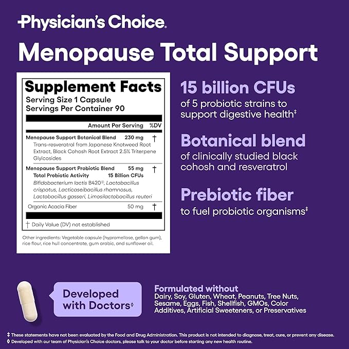 Physician's CHOICE Menopause Probiotic Supplement for Women - Supports Hormone Balance, Hot Flashes, Night Sweats, Weight Management, Bloating & Gut Health - with Black Cohosh, Resveratrol+ - 90ct