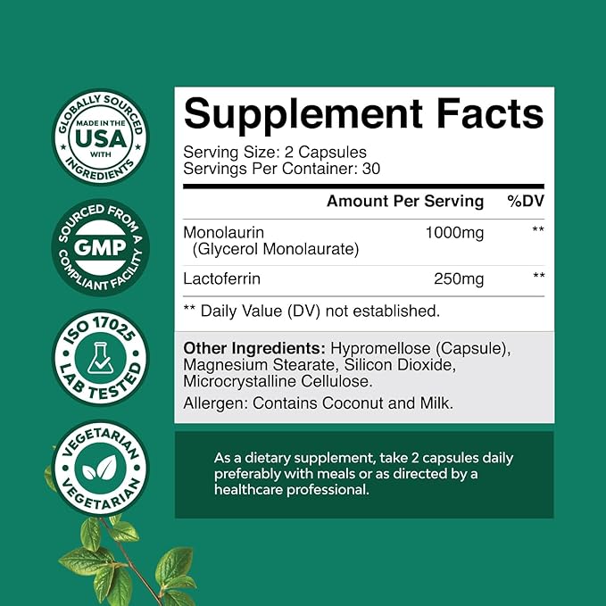 - Clean Formulas - We proudly source our monolaurin from coconuts and our lactoferrin from carefully sourced freeze dried cow's milk and manufacture and test in American GMP and ISO 17025 labs