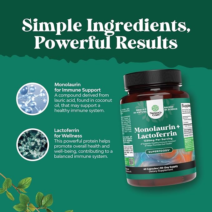 Natures Craft High Strength 250mg Lactoferrin & 1000mg Monolaurin Supplement (30 Servings) - Microbiome Digestive Health Immune Support Supplement - Lactoferrin and Monolaurin Capsules - Vegetarian