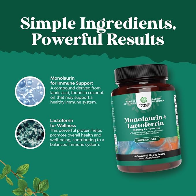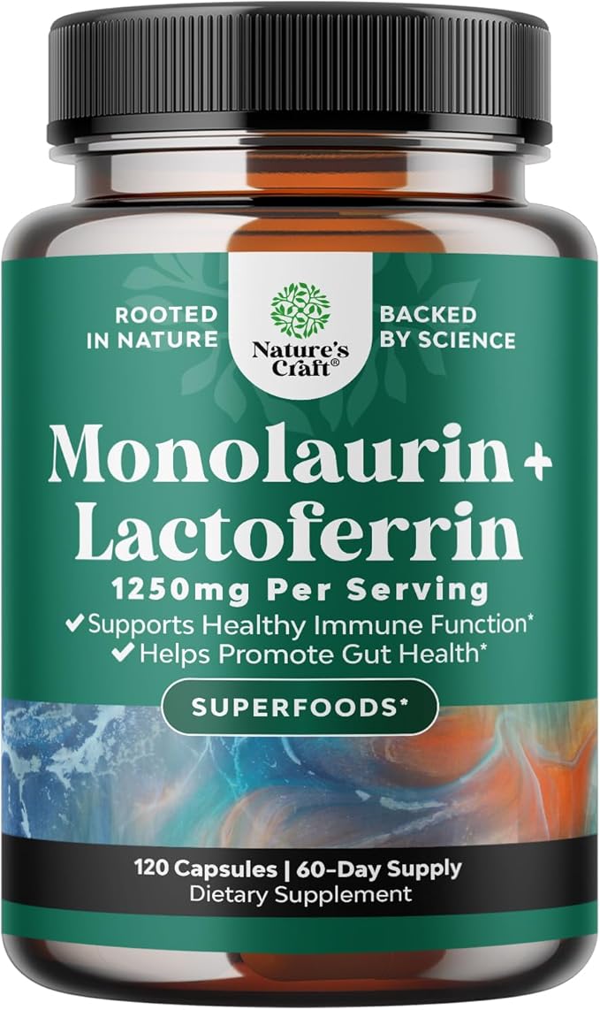 Natures Craft High Strength Lactoferrin & Monolaurin Supplement - Microbiome Digestive Health Immune Support Supplement - 250mg Lactoferrin and Monolaurin 1000mg Capsules - Vegetarian (60 Servings)