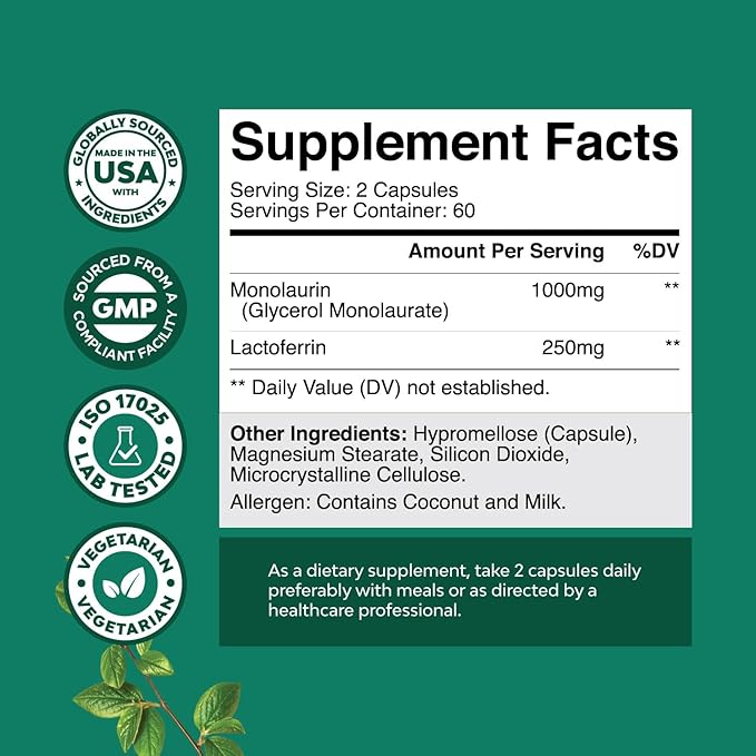 - Clean Formulas - We proudly source our monolaurin from coconuts and our lactoferrin from carefully sourced freeze dried cow's milk and manufacture and test in American GMP and ISO 17025 labs
