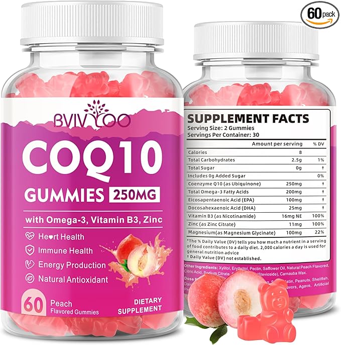 - AGE-DEFYING ENERGY BOOST: As life's demands increase, our bodies' natural CoQ10 production can decline, leading to feelings of fatigue and muscle weakness. Our gummies, packed with 250mg of high-potency CoQ10 per serving, fortify your muscles with the energy they need for smoother contractions and reduced fatigue. Experience the difference as you regain your vitality and tackle life's challenges with renewed vigor.