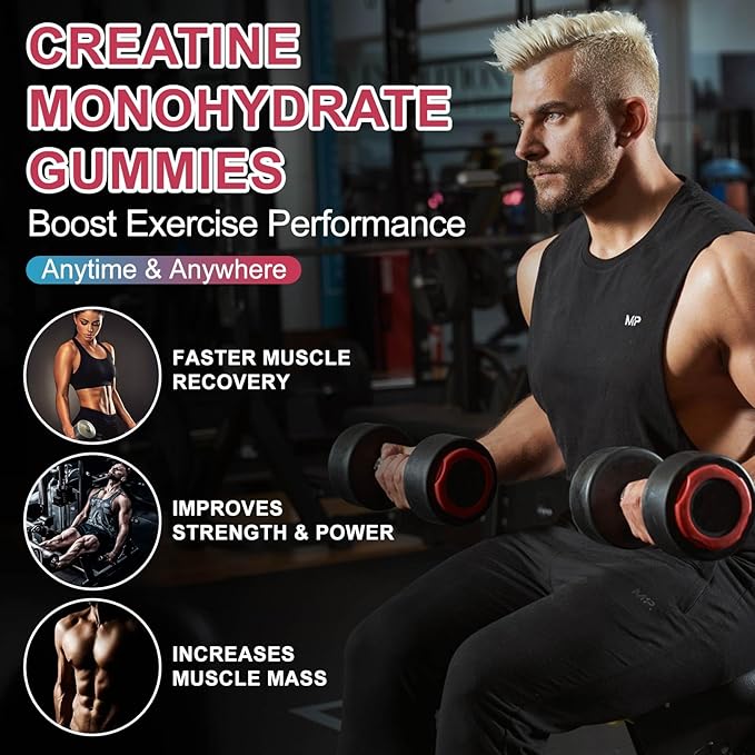 - [Creatine Monohydrate Gummies]:Creatine is one of the most effective, safe, and well-studied supplement to improve performance,increased muscle endurance,muscle growth or recovery. Just 2 gummies per serving to meet your daily 5g creatine requirement. Get ready to get bigger, stronger, and push beyond your limits — naturally.