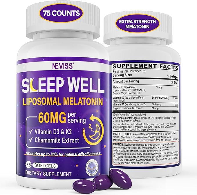 NEVISS 1Pack 60mg Melatonin Liposomal for Adults, High Dose Deep Rest & Brain Cognition, Extra Strength with Vitamin D3, K2, Chamomile for Sound Zzz Cycle, Power Antioxidant, 75 Softgels